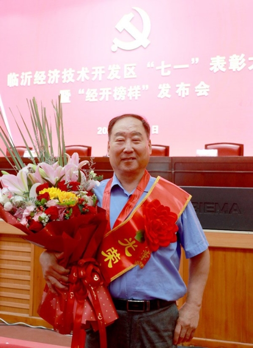退休老党员谭玉生代表老党员在开发区召开的“七一”表彰大会上领受“光荣在党50年”纪念章